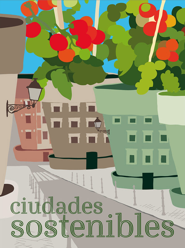 La ilustración representa una ciudad cuyas casas, a modo de macetas, albergan pequeñas plantaciones para consumo local.